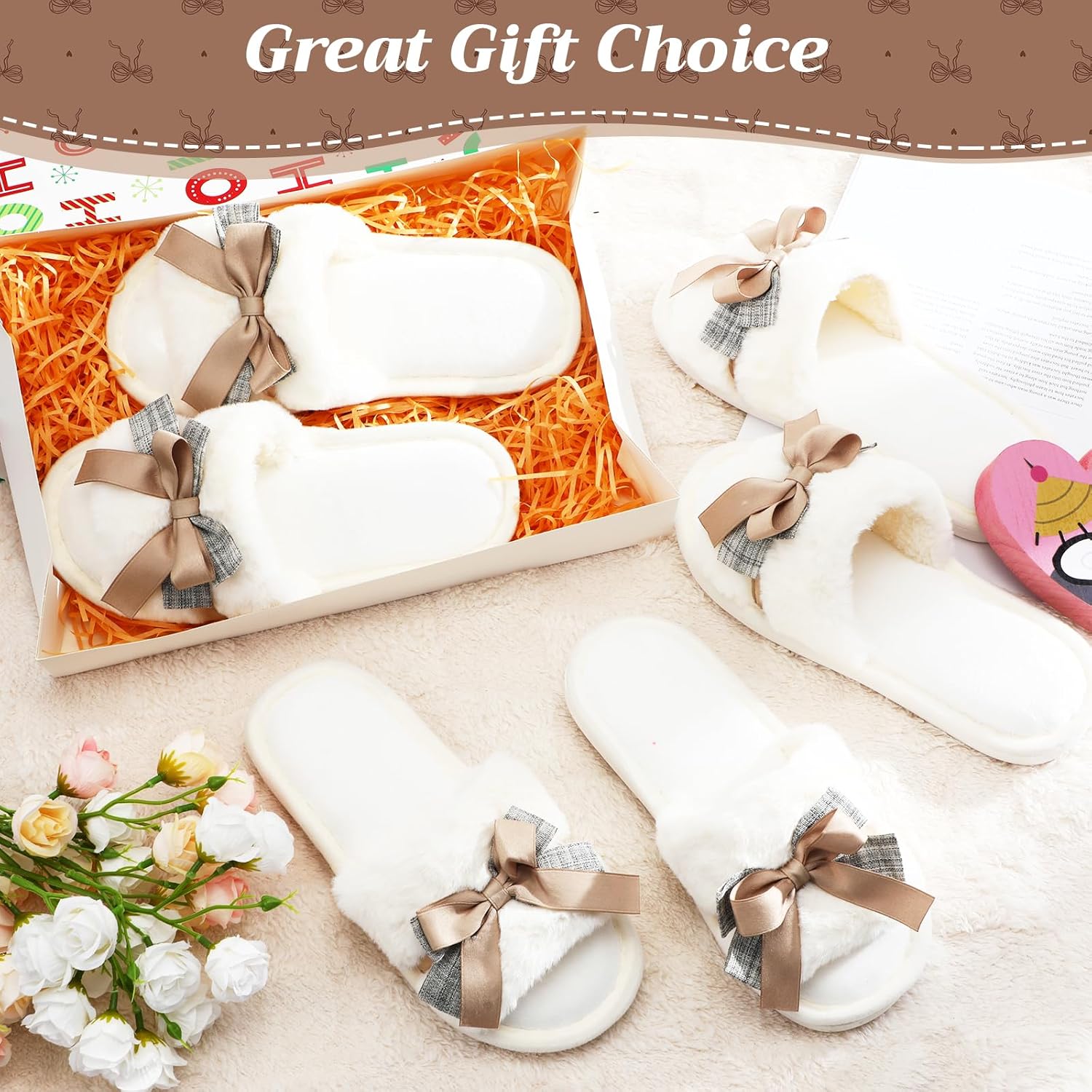 2 reviews for 6 Pairs Wedding Cute Bow Slippers Bulk for Women White Fuzzy Open Toe Bridesmaid Slippers for Christmas Birthday Party Besties Gifts Comfy Memory Foam Indoor Outdoor House Shoes