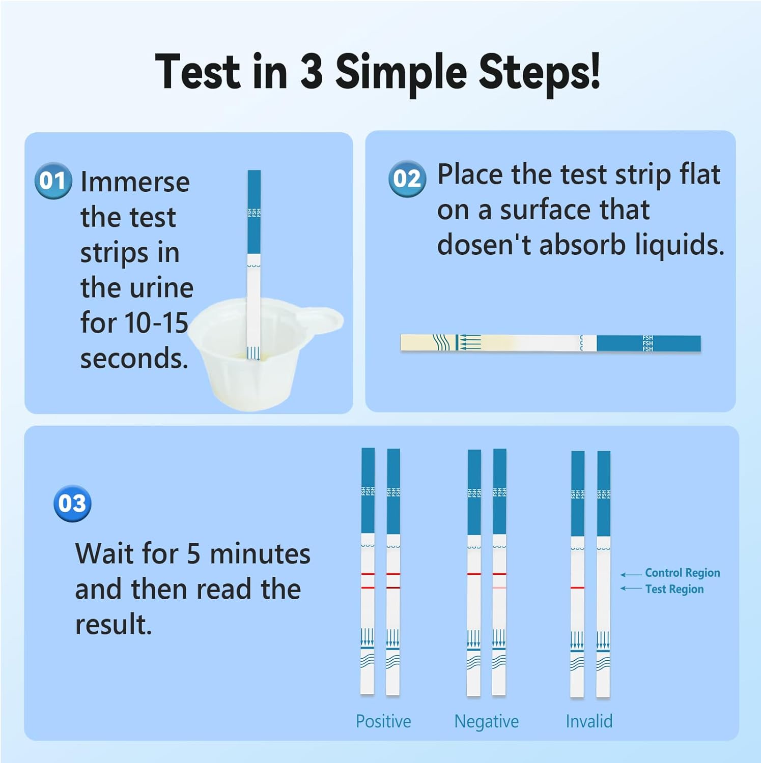 Interpretation of Negative Results: An initial negative result (only control line C visible or test line T lighter than C) means the FSH level in urine is <25 mIU/mL. It is recommended to retest after 7 days. If symptoms persist despite a second negative result, consult a healthcare provider for further diagnosis.
