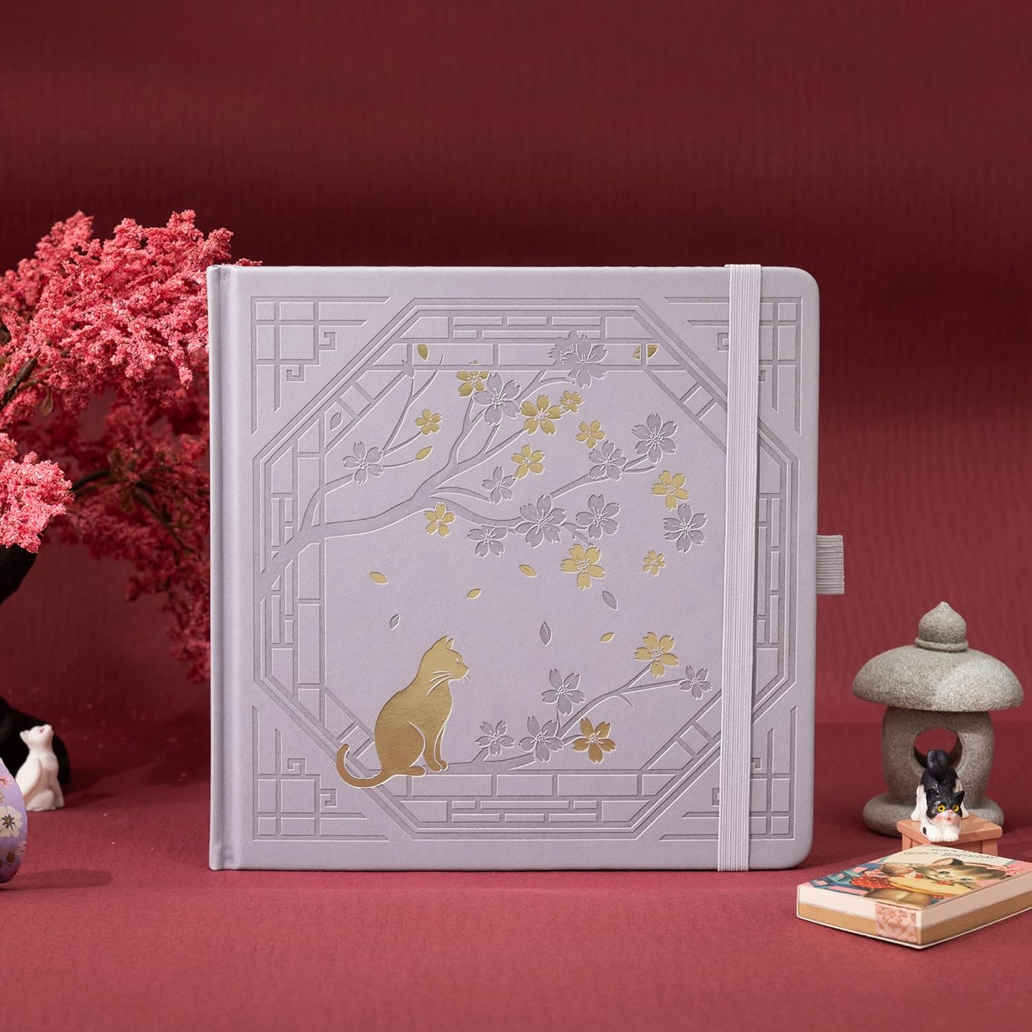 Cat and Sakura Cover Design: TIEFOSSI cute journal cover features faux leather with embossed technology, depicting a cat resting beneath a cherry blossom tree in a courtyard. Beautiful patterns paired with the gold-edged pages infuses the notebook with vibrant artistic charm, elevating it into a work of art that combines both practical use and collectible value.